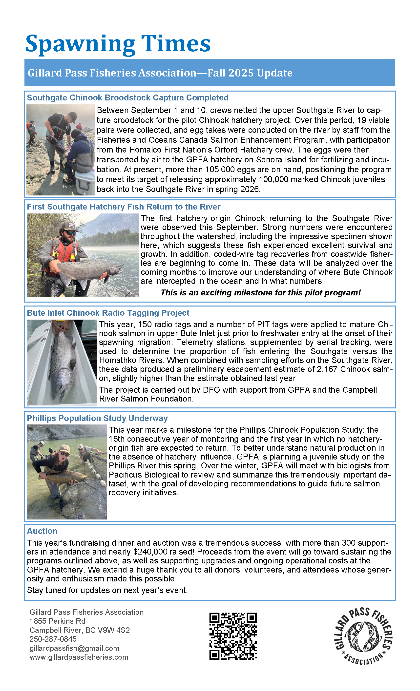 Support for Gillard Pass continues to be strong thanks to the generosity of the individuals and businesses who make up the Stuart Island community. This support has allowed GPFA to continue to be a leading salmon enhancement group on the coast.